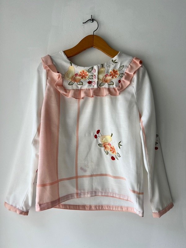 Blusa confeccionada a partir de un mantel de algodón bordado con frutas.